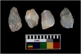 | Description / विवरण | There are n 4 utilized flake cores. There are multi directional irregular scar pattern on them. Two are tapering at one end and two have blunted edges. |