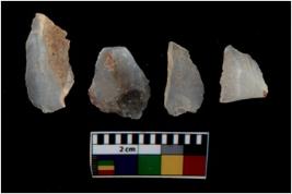 | Description / विवरण | There are n 4 utilized flake cores. There are multi directional irregular scar pattern on them. Three are tapering at one end and one has sharp edge. |