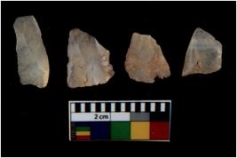 | Description / विवरण | There are n 4 utilized flake cores. There are multi directional irregular scar pattern on them. One is tapering at one end and three have blunted edges. |