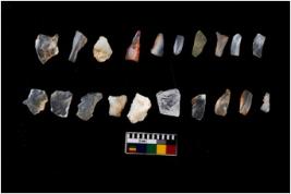 | Description / विवरण | Specimen of flakes tool with prominent flaking marks. It made up of a short flakes with sides trimmed. |