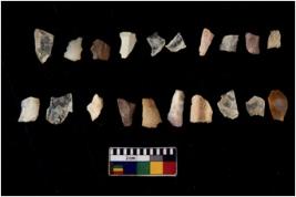 | Description / विवरण | Specimen of flakes tool with prominent flaking marks. It made up of a short flakes with sides trimmed. |