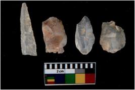| Description / विवरण | There are n 4 utilized flake cores. There are multi directional irregular scar pattern on them. Three are tapering at one end and one has sharp edge. |