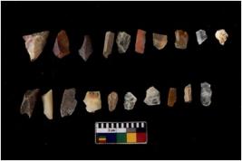 | Description / विवरण | Specimen of flakes tool with prominent flaking marks. It made up of a short flakes with sides trimmed. |