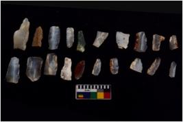 | Description / विवरण | Specimen of flakes tool with prominent flaking marks. It made up of a short flakes with sides trimmed. |