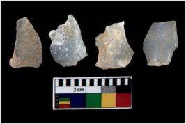 | Description / विवरण | There are n 4 utilized flake cores. There are multi directional irregular scar pattern on them. Two are tapering at one end and two have sharp edges. |