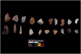 | Description / विवरण | Specimen of flakes tool with prominent flaking marks. It made up of a short flakes with sides trimmed. |