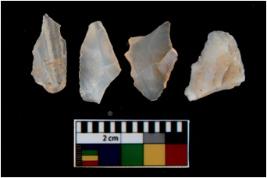 | Description / विवरण | There are n 4 utilized flake cores. There are multi directional irregular scar pattern on them. Three are tapering at one end and one has sharp edge. |