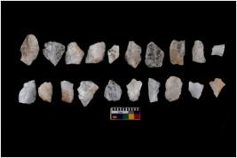 | Description / विवरण | Specimen of flakes tool with prominent flaking marks. It made up of a short flakes with sides trimmed. |