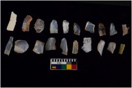 | Description / विवरण | Specimen of flakes tool with prominent flaking marks. It made up of a short flakes with sides trimmed. |
