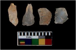 | Description / विवरण | There are n 4 utilized flake cores. There are multi directional irregular scar pattern on them. All of them are tapering at one end. |