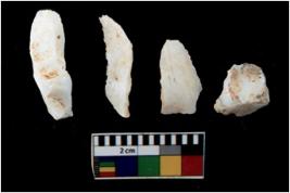 | Description / विवरण | There are n 4 utilized flake cores. There are multi directional irregular scar pattern on them. Two are tapering at one end and two have blunted edges. |