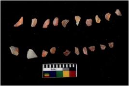 | Description / विवरण | Specimen of flakes Chips with prominent flaking marks. It made up of a short flakes with sides trimmed. |
