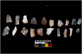 | Description / विवरण | Specimen of flakes tool with prominent flaking marks. It made up of a short flakes with sides trimmed. |