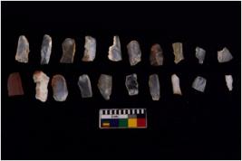 | Description / विवरण | Specimen of flakes tool with prominent flaking marks. It made up of a short flakes with sides trimmed. |