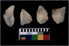 | Description / विवरण | There are n 4 utilized flake cores. There are multi directional irregular scar pattern on them. All of them are tapering at one end. |