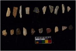 | Description / विवरण | Specimen of flakes tool with prominent flaking marks. It made up of a short flakes with sides trimmed. |