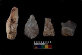 | Description / विवरण | There are n 4 of utilized worked cores and show multidirectional irregular scar pattern on both dorsal and ventral sides. They have a broken tip. |
