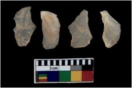 | Description / विवरण | There are n 4 utilized flake cores. There are multi directional irregular scar pattern on them. All of them are tapering at one end. |