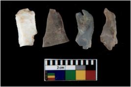 | Description / विवरण | There are n 4 utilized flake cores. Out of them three are made up of Chalcedony and one is made up of Chert. There are multi directional irregular scar pattern on them. All of them are tapering at one end. |