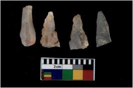 | Description / विवरण | There are n 4 utilized flake cores. Out of them two are made up of Chalcedony and two are made up of Chert. There are multi directional irregular scar pattern on them. All of them are tapering at one end. |
