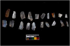 | Description / विवरण | Specimen of flakes tool with prominent flaking marks. It made up of a short flakes with sides trimmed. |