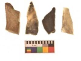 | Description / विवरण | There are n 4 utilized flakes. There are multi directional irregular scar pattern on both dorsal and ventral face of the flakes. Two are tapering at one end and two have sharp edges. |