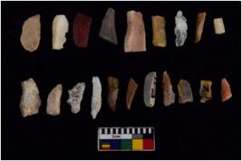 | Description / विवरण | Specimen of flakes tool with prominent flaking marks. It made up of a short flakes with sides trimmed. |