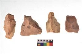 | Description / विवरण | There are n 4 utilized flake cores. There are multi directional irregular scar pattern on both dorsal and ventral face of the flake cores. Two are tapering at one end and two have blunted edges. |