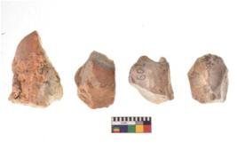| Description / विवरण | There are n 4 utilized flake cores. There are multi directional irregular scar pattern on both dorsal and ventral face of the flake cores. One is tapering at one end and three have blunted edges. |
