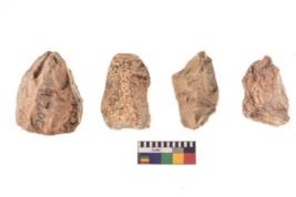 | Description / विवरण | There are n 4 utilized flake cores. There are multi directional irregular scar pattern on both dorsal and ventral face of the flake cores. All of them are tapering at one end. |