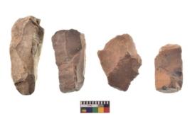 | Description / विवरण | There are n 4 utilized flake cores. There are multi directional irregular scar pattern on both dorsal and ventral face of the flake cores. All of them are tapering at one end. |