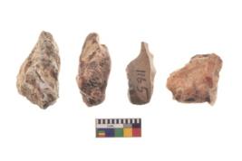 | Description / विवरण | There are n 4 utilized flake cores. There are multi directional irregular scar pattern on both dorsal and ventral face of the flake cores. Three are tapering at one end and one has blunted edge. |
