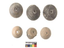 | Description / विवरण | Six areca nut shaped beads with flat base, well fired. |