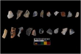 | Description / विवरण | Specimen of flakes tool with prominent flaking marks. It made up of a short flakes with sides trimmed. |
