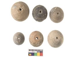 | Description / विवरण | Six areca nut shaped beads with flat base, well fired. |