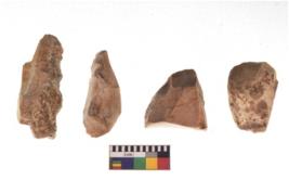 | Description / विवरण | There are n 4 utilized flake cores. There are multi directional irregular scar pattern on both dorsal and ventral face of the flake cores. Two are tapering at one end and two have blunted edges. |