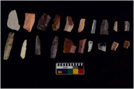 | Description / विवरण | Specimen of flakes tool with prominent flaking marks. It made up of a short flakes with sides trimmed. |