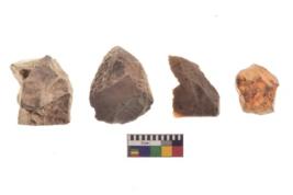 | Description / विवरण | There are n 4 utilized flake cores. There are multi directional irregular scar pattern on both dorsal and ventral face of the flake cores. Three have round edges and one has blunted edge. |
