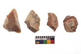 | Description / विवरण | There are n 4 utilized flake cores. There are multi directional irregular scar pattern on both dorsal and ventral face of the flake cores. One has sharp edge and three have blunted edges. |