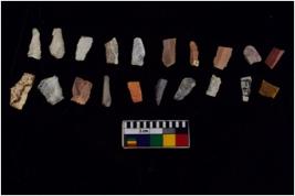| Description / विवरण | Specimen of flakes tool with prominent flaking marks. It made up of a short flakes with sides trimmed. |