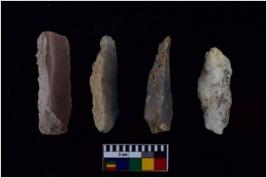 | Description / विवरण | There are n 4 utilized flake cores. Out of them three are made up of Chert and one is made up of Quartz. There are multi directional irregular scar pattern on both dorsal and ventral face of the flake cores. All of them are tapering at one end. |
