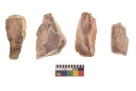 | Description / विवरण | There are n 4 utilized flake cores. There are multi directional irregular scar pattern on both dorsal and ventral face of the flake cores. All of them are tapering at one end. |