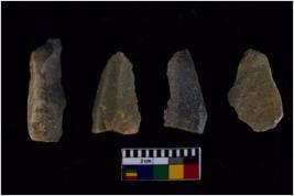 | Description / विवरण | There are n 4 utilized flake cores. There are multi directional irregular scar pattern on both dorsal and ventral face of the flake cores. All of them are tapering at one end. |