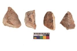 | Description / विवरण | There are n 4 utilized flake cores. There are multi directional irregular scar pattern on both dorsal and ventral face of the flake cores. All of them are tapering at one end. |