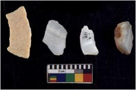 | Description / विवरण | There are n 4 utilized flake cores. There are multidirectional irregular scar pattern on both dorsal and ventral face of the flake cores. One has sharp edges and three have blunted edges. |