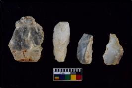 | Description / विवरण | There are n 4 utilized flake cores. There are multi directional irregular scar pattern on both dorsal and ventral face of the flake cores. Two are tapering at one end and two have blunted edges. |