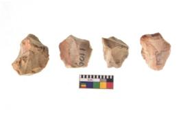 | Description / विवरण | There are n 4 utilized flake cores. There are multi directional irregular scar pattern on both dorsal and ventral face of the flake cores. One has flat base and three have blunted edges. |