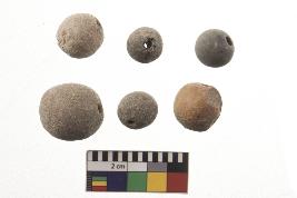 | Description / विवरण | Six globular shaped beads with flat base; well fired |