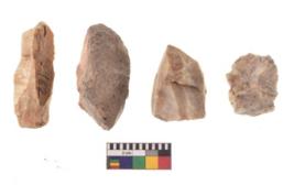 | Description / विवरण | There are n 4 utilized flake cores. There are multi directional irregular scar pattern on both dorsal and ventral face of the flake cores. Two are tapering at one end and two have blunted edges. |