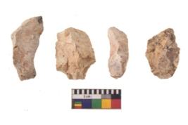 | Description / विवरण | There are n 4 utilized flake cores. There are multi directional irregular scar pattern on both dorsal and ventral face of the flake cores. All of them are tapering at one end. |